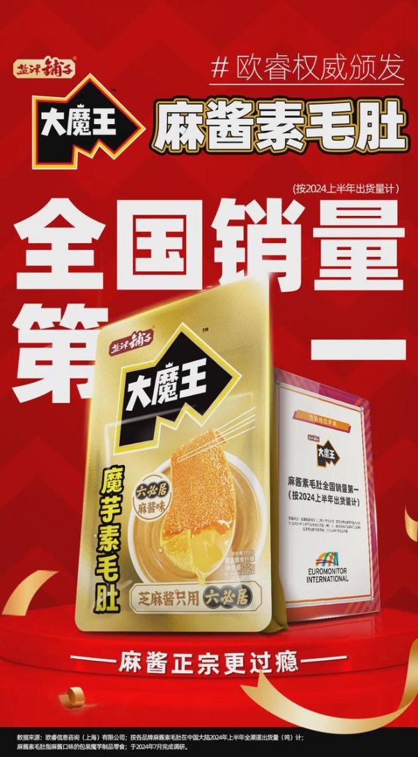 通过欧睿国际对中国大陆区魔芋领域的数据统计和市场调研,让大魔王“麻酱素毛肚全国销量第一”的市场地位声明更具有充分的信服力。