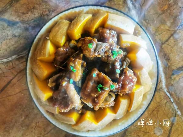 5、找一个大点儿的盘子,将腌好的排骨摆在盘中央,南瓜块围着排骨摆一圈即可。