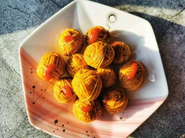 2、准备一把新鲜的湿面条,要用细面条哦,再轻轻地绕满鹌鹑蛋,这是考验你耐心的时候。最后收口时如果面条太干,就沾一点儿水容易捏合在一起。