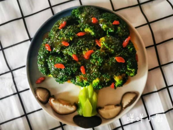 所需食材:西兰花1颗、鲜香菇2朵、枸杞子少许、酱油2勺、蚝油1勺、玉米淀粉1勺。