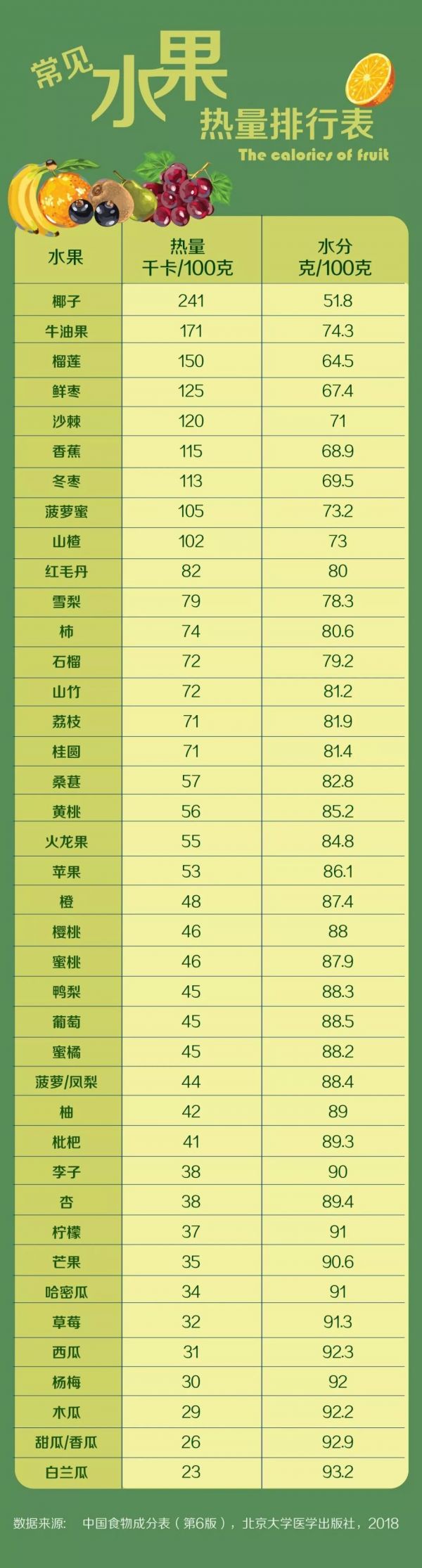 我们来做一个对比,米饭的热量为116千卡/100克,两个鸡蛋的热量约为158 千卡,常见的牛油果、榴莲、椰子的热量都比米饭和鸡蛋高。水果热量的高低,与它的含糖量和脂肪含量有关,但仅凭甜度来判断水果的热量是不科学的。