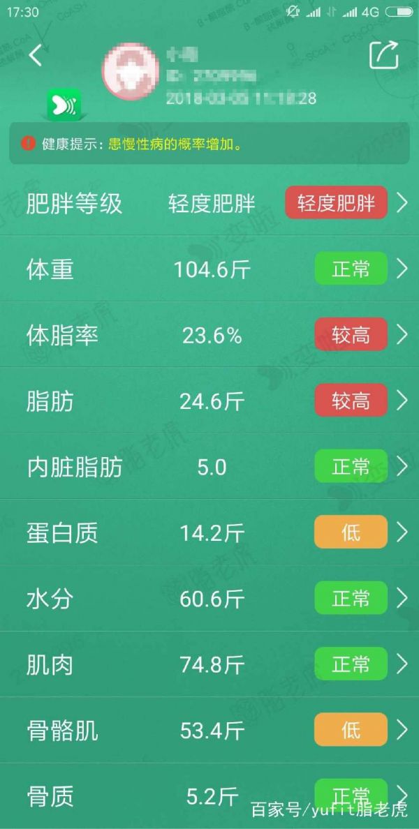 在体重正常的情况下,我们可以通过上面的数据,清晰地看到这个用户属于轻度肥胖,体脂率偏高,而体脂率是指人体内脂肪重量在人体总体重中所占的比例,反映人体内脂肪含量的多少。想要了解更多的数据详情,可以上变啦APP哦。返回搜狐,查看更多