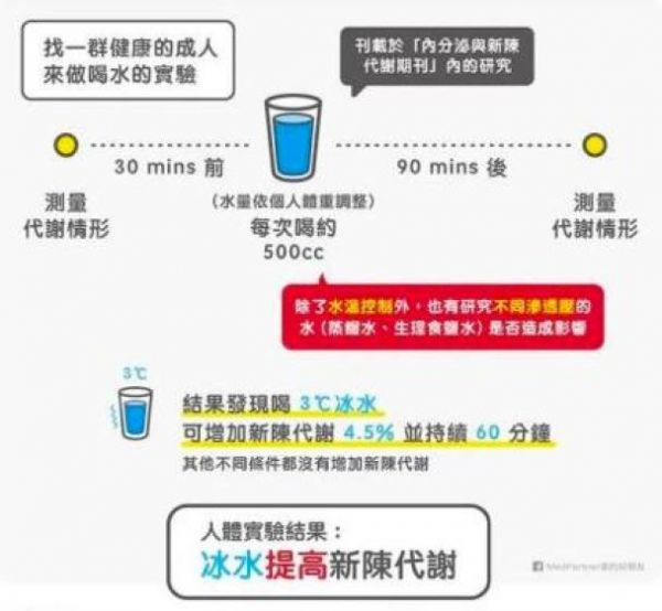 不过令人意想不到的是,有一项人体实验的结果显示:室温水对新陈代谢无影响,而冰水可以提高新陈代谢。这个实验结果也曾被刊登在了《内分泌与新陈代谢期刊》,实验是将一群健康的成年人分为3组,实验前先测了一下各自的代谢情况,然后给有些人喝常温蒸馏水、有些人喝常温生理食盐水、另一部分人喝3℃的冰水。 结果发现,不管是喝常温蒸馏水还是生理食盐水,都不能增加新陈代谢;但是喝3°C的低温冰水后,这些人的新陈代谢竟然提高了4.5%,并且这一效果可持续60分钟。