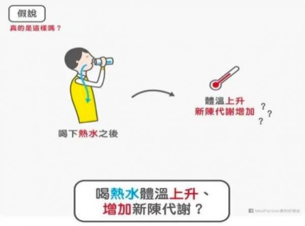 流言:喝热水能提到代谢,一是喝了热水会出汗,出汗了体重会减轻。二是认为喝热水后身体温度会上升,体温上升了,新陈代谢就会随之增加。