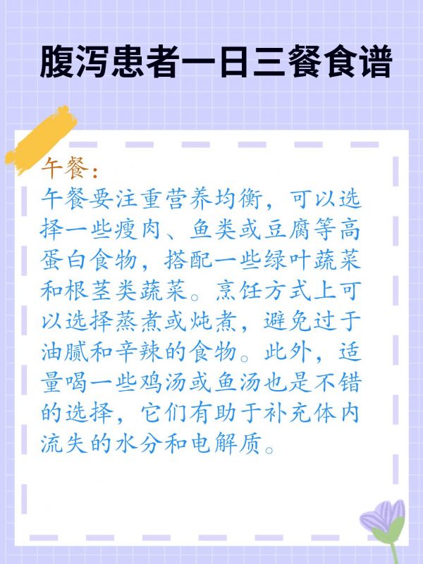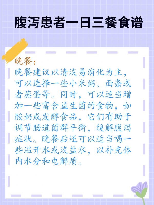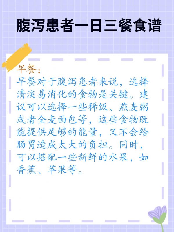 我深知这时候除了药物治疗,合理的饮食调整也非常关键。 于是,我为他制定了一份腹泻一日三餐的食谱。下面,我就和大家分享一下这份食谱,希望能为大家提供一些实用的参考: