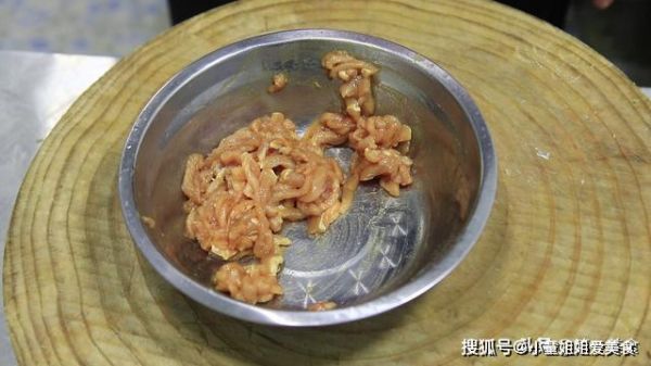 1.首先我们准备猪瘦肉200克,先切成薄片,再切成肉丝,切好之后我们把肉丝腌一下,盆中加入食盐1克,鸡粉2克,胡椒粉1克,老抽2克调底色,料酒5克去腥,多搅拌一会把料汁全部打入肉丝里面。