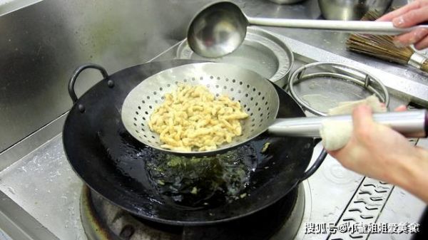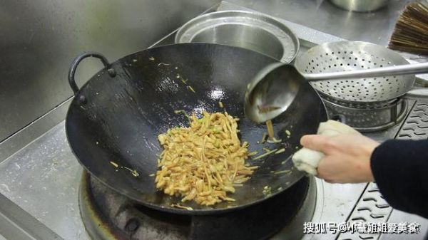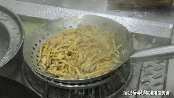 4.食材全部准备好以后,我们把肉丝滑一下油,锅内多烧一些油,油温四成热把肉丝放入锅中,轻轻晃动锅防止肉丝粘在锅底,肉丝定型以后,把粘连在一起的打散,滑油30秒钟肉丝变白后立即捞出控油,肉丝滑油的时间不要太长,否则口感不够鲜嫩。