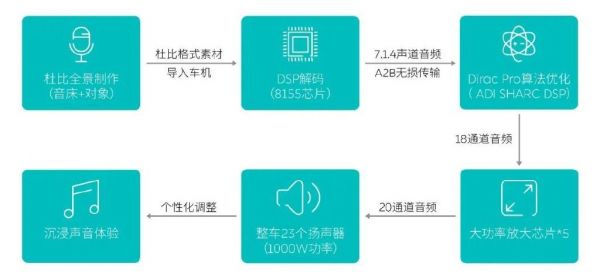 以蔚来ET7为例,声音内容以杜比全景声的格式传输到车上,高通8155芯片的DSP将内容解码渲染为7.1.4声道音频信号,通过高带宽双向数字音频总线(A2B)以无损方式传输,在ADI品牌旗舰DSP——SHARC+ 21565 中进行处理,通过5颗功率放大芯片,再以1,000W的额定功率输出到23个扬声器。由此,聆听到的声音层次将更饱满、更清晰、更丰富,愈发贴近音乐本身。