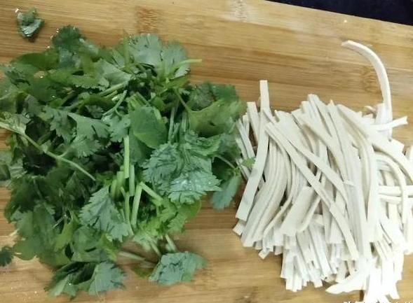 2、食材处理:将香菜用清水浸泡10分钟,然后用流动水冲洗干净,控干水分后切成小段。将千张洗净,切成细丝。