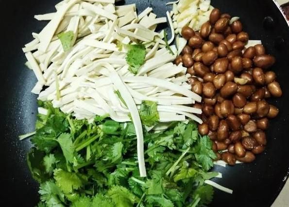 3、调料准备:取一个盆或锅,将香菜段、千张丝、花生米和蒜末放入其中。