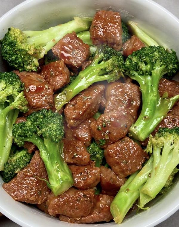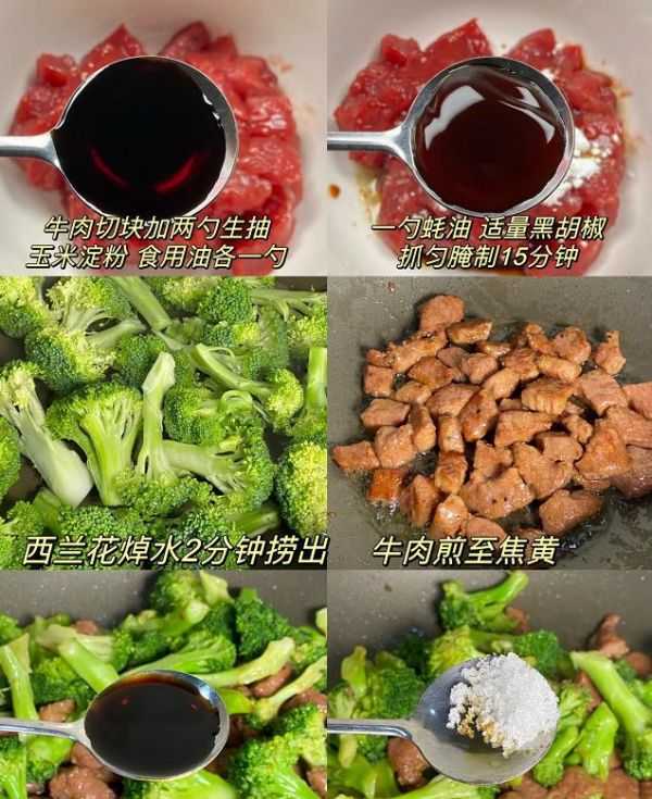 3. 热锅倒油,油热后放入腌好的牛肉,煎至焦黄。倒入焯好的西蓝花,翻炒均匀。
