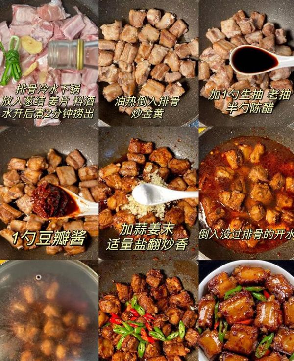 1. 排骨冷水下锅,加入葱姜料酒,焯水5分钟,捞出洗净。热锅倒油,油热后放入排骨,煎至金黄。