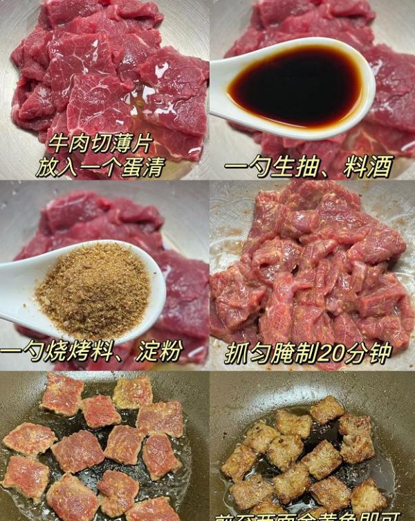 1. 牛肉切成薄片,加入蛋清、生抽、料酒、烧烤料、淀粉抓匀,腌制20分钟。