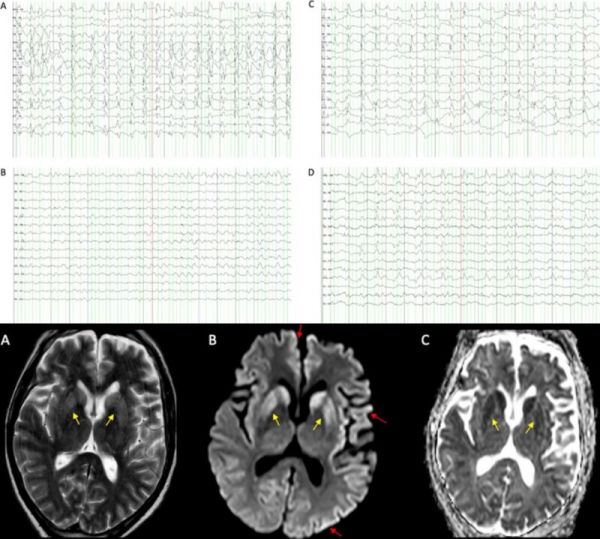 MRI:皮质回处出现皮质带状高密度,T2/FLAIR(下图 A)和 DWI(下图 B)序列双侧尾状核和内囊高信号,ADC 示相应低密度信号(下图 C)。