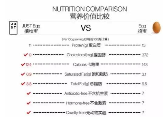 绿豆中的蛋白质和鸡蛋含有许多相同的氨基酸,尤其是进行凝胶化和乳化所需的氨基酸,这有助于形成煎蛋和炒鸡蛋的凝乳质地。与传统鸡蛋相比,绿豆蛋不含胆固醇,只有极少的饱和脂肪,也不含鸡蛋中可能存在的抗生素、激素,并且蛋白质含量总体上与真正的鸡蛋接近(一份Just Just鸡蛋含5g蛋白质,而传统的150g鸡蛋约含6g)。