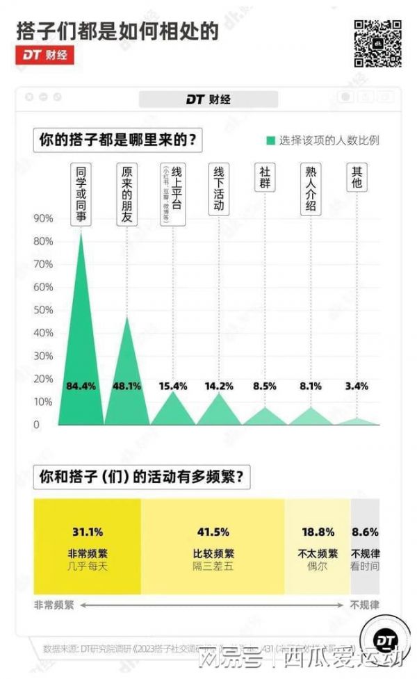 根据DT财经和DT研究院联合发布的《2023搭子社交小报告》,在收集的1431份答卷中,超过一半的人拥有至少一个搭子,有95.8%的受访者表现出了对这种陪伴型社交的需求。