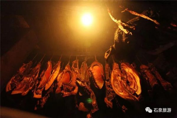 每年冬腊月,农家都把辛苦养了一年的猪宰杀,新鲜的猪肉切成长块,每块3至5斤重。加拌适量的花椒粉,辣椒面,传统香料面。一块一块的用盐抹;然后一起腌在木桶里。过个把星期,就把肉从桶里取出,挂在火塘上面任其烟熏火烤。在老家都是用青杠树、柏树枝、锯木面、谷壳来熏得,不过二十来天,猪肉就慢慢地变黑,待到最后变成金黄,就可以把肉取下,把阳尘拍打干净,一块块地放进仓库的谷子里,腊肉就做成了。这样做成的腊肉,可以保二三年不坏。而且放的越久,味道越香。而且吃起来就不觉得油腻。挑选好的烟熏腊肉,再用旺火烧,这是腊肉好吃的关键,一是为了去毛,二是将肉皮烧软。少了这个步骤,腊肉皮太硬,咬不烂。独特的烟熏味道,肥肉香滑软嫩,瘦肉嚼劲十足,油而不腻,味浓但不过咸,吃着上瘾。