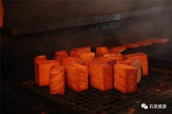 柴火烟熏豆腐干,也是当地人入冬后喜爱的一类食物。每块长宽,厚度和重量都按一定比例制作,外观看上去壮实憨厚得像人一样。上面在撒上盐,花椒粉,辣椒面等传统香料面,用柴火慢慢熏烤,直至豆干水分烘干两面被烤的焦黄,捏起来紧实,直至熏得散发出如烟熏腊味般的诱人香气才算制作完工,味道清香爽口、硬中带韧、风味独特。