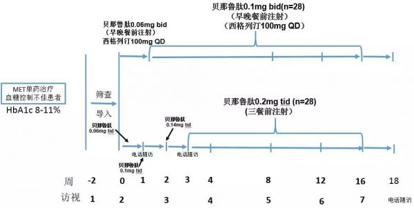 该研究为一项多中心、平行、随机、对照临床试验,将在中国4家研究中心开展,入选56例年龄18~70岁、HbA1c 8%~11%、使用二甲双胍稳定剂量(≥1000 mg/d)治疗3个月以上血糖仍未达标的T2DM患者,在二甲双胍原治疗方案不变的基础上,以1:1比例随机分为贝那鲁肽联合西格列汀治疗组和贝那鲁肽治疗组,治疗16周后,比较两治疗方案的有效性和安全性。