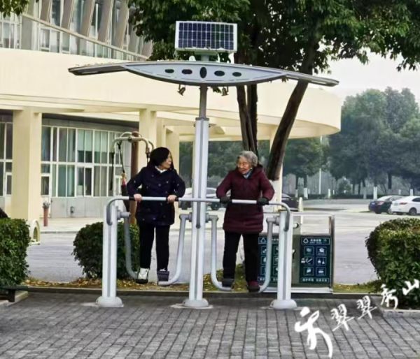 同时,这些智能健身器材还采用了先进的太阳能蓄电技术,顶部巧妙地设计为椭圆形的防雨遮阳棚,既节能环保,又大大提升了使用者的锻炼体验,让老年朋友在享受健康运动的同时,也能感受到来自科技与自然的双重呵护。