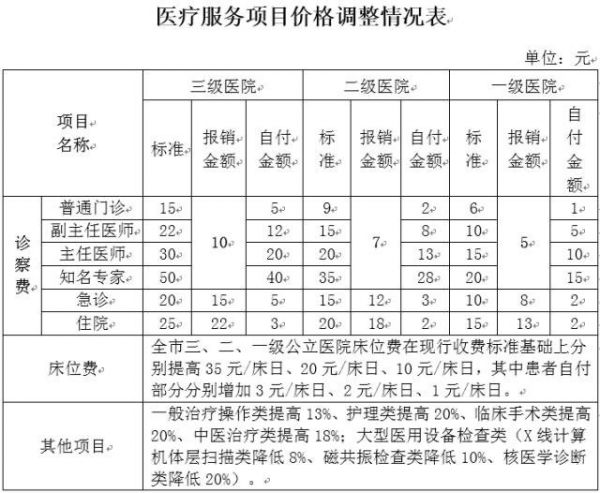 床位费方面,一、二、三级公立医院在现行床位费收费标准基础上分别提高了10元、20元、35元,其中医保定额报销9元、18元、32元,患者自付部分只增加了1元、2元、3元。
