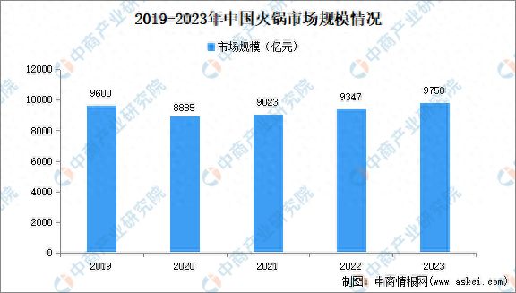 2023年,随着餐饮市场的持续回暖,餐饮消费热情得到释放,火锅行业作为正餐赛道的领头羊,焕发出了新的发展活力。数据显示,2023年中国火锅市场规模达9758亿元,同比增长4.4%。