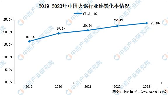 在餐饮业,火锅是公认的标准化程度较高的行业。近年来,中国火锅行业连锁化率不断提升,从2019年的16.3%上升到2023年的23.6%,较2019年提升44.79%。