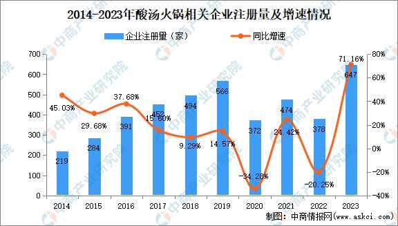 数据显示,近十年酸汤火锅相关企业注册量呈整体增长态势,2019年全年注册566家,达第一个注册量小高峰。而后受客观环境影响,酸汤火锅相关企业注册量稍有波动,2023年迎增长高峰,全年注册量同比增长71.16%至647家,创近十年新高。