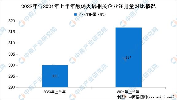 截至2024年7月25日,今年已注册368家酸汤火锅相关企业,趋近2022年全年注册水平。其中,今年上半年注册317家,延续了去年增长态势,较去年同期增加了17家。
