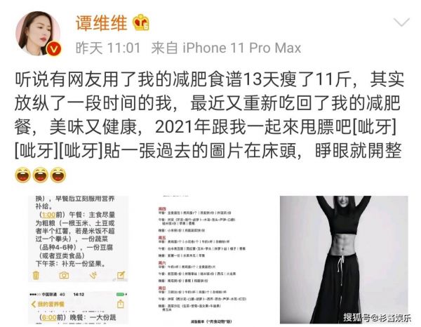 1月8日,谭维维在个人社交平台发文称:听说有网友用了我的减肥食谱13天瘦了11斤,其实放纵了一段时间的我,最近又重新吃回了我的减肥餐,美味又健康,2021年跟我一起来甩膘吧,还配上自己过去8块腹肌的照片和自己的减肥食谱。