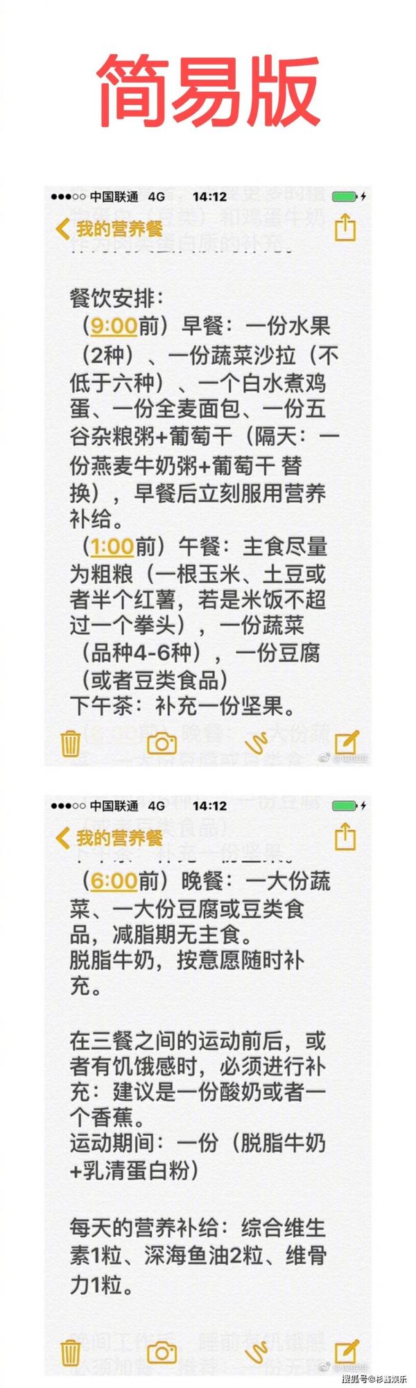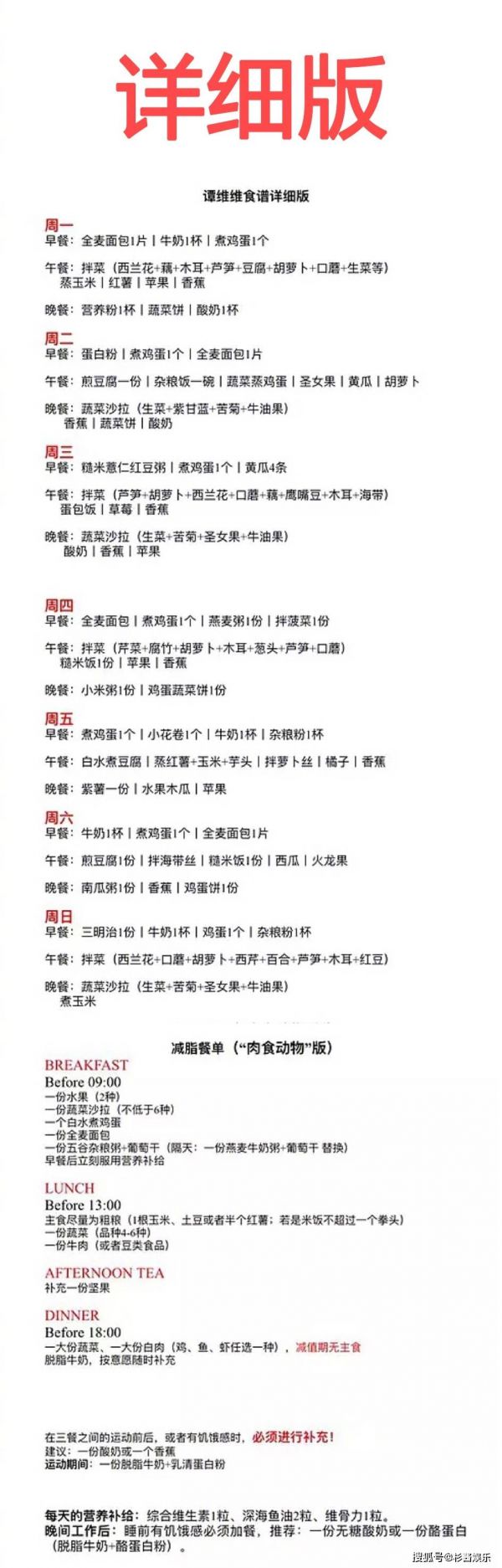 这份减肥食谱真的太详细了,谭维维也是非常贴心,将自己减肥食谱的简易版和详细版均发布在网上,供大家参考。在减肥食谱的简易版中,她早餐是一份水果、一份蔬菜沙拉、一个白水煮鸡蛋、一份全麦面包、一份五谷杂粮粥+葡萄干,午餐主食尽量为粗粮,一般是一根玉米、土豆或者半个红薯,米饭的话不会超过一个拳头、一份4-6种的蔬菜、一份豆类食品,晚餐是一大份蔬菜、一大份豆腐或者豆类食品,减脂期不吃主食,脱脂牛奶随时可以补充,再配合相应的运动。