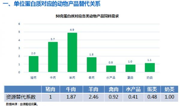 要保持蛋白质摄入量不变,根据测算,如果减少一斤猪肉消费,需要增加同等的禽肉(或蛋类)消费,或0.76斤牛肉、1.33斤水产品、4.4斤牛奶和0.88斤羊肉。从节约消费支出的角度,用蛋类替代最省钱,其次分别为禽肉和水产品。从资源分析来看,牛肉和羊肉相比较而言需要更多的饲料资源来支撑,禽肉、水产品、蛋类和奶类更节约资源。如果用禽肉、水产品和蛋类来替代,全年可以减少饲料粮需求300万吨到1400万吨之间,在中美贸易摩擦背景下,如果用国内资源保障畜产品消费,非常迫切和必要。