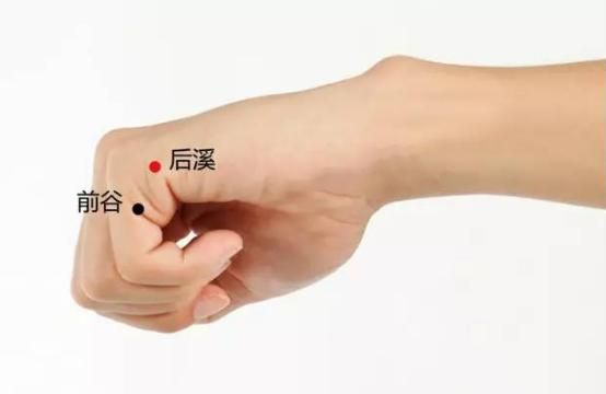 第二个穴位就是后溪穴,在我们的小肠经上,找这个穴的时候,我们可以把双手握拳,会看到手的小拇指这一侧有个尖尖的凸起,就在这个位置,可以用这两个部位来对碰,能够清心安神,活血通络,临床上也常用来治疗头痛,颈椎病,腰腿疼痛等问题。