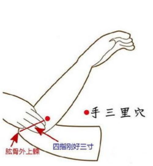 第三个是手三里,在我们的手阳明大肠经上,取穴时要手臂曲臂,手肘弯曲处向小臂方向比三指的位置,用手按一下,感觉痛了,就找到位置了。每次可以左右交替刺激30下,此穴既可以清理肠胃的热火,还可以理气活络,临床上常用来治疗手臂的麻木,半身不遂,甚至是肠炎,腮腺炎,面部神经麻痹,牙痛,腰痛等问题。