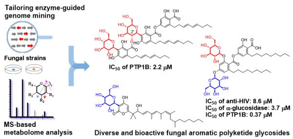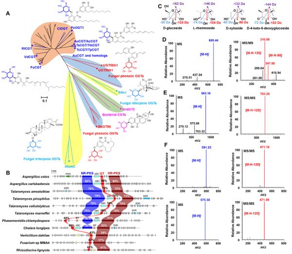 糖苷化合物是活性天然产物及临床药物的重要组成部分,其分子中的糖基基团不仅是重要的药效基团,还可改善化合物的药代动力学特性,增加成药性。天然糖苷化合物大多数来源于植物和细菌,真菌中发现的糖苷极少。目前,依靠传统发酵、提取分离方法从真菌中仅发现400多个糖苷化合物。自然界中至少存在200万种真菌,蕴含着巨大的糖苷类化合物生物合成潜力,但仅依靠传统的分离纯化手段严重限制了新颖活性糖苷化合物的高效发现与分子创新。因此,如何从数量庞大的真菌中高效、定向挖掘新颖结构活性糖苷并进行分子创新是目前该领域研究的难点。