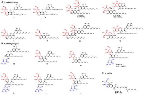 图3. 三株代表性真菌中新颖糖苷化合物