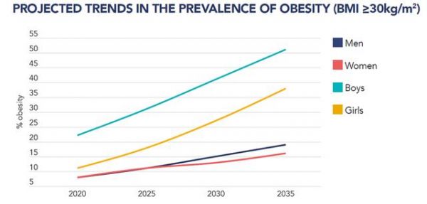 一项针对中国一万多名青少年和年轻人的研究发现,2020年初的封锁期间,肥胖率从10%增加到12.5%,超重率从21%增加到25%。世界肥胖联盟(World Obesity Federation)发布的最新一期《世界肥胖地图》(World Obesity Atlas)中指出,按照目前的趋势发展,2035年,中国成年男性的肥胖率(BMI大于等于30)将达到20%左右,女性达到15%以上,而男童的肥胖率将达到惊人的50%(图2)。