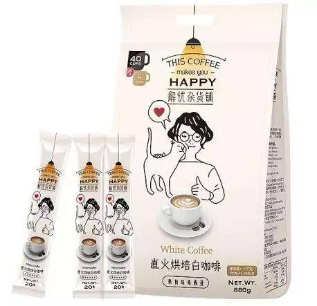 解忧杂货铺白咖啡产品采用便携的塑料拎手袋装,每包44杯,满足一个月的工作日,每天都可以喝到两杯冲调方便的美味咖啡。在包装上,“解忧杂货铺”白咖啡采用了淡雅简约的手绘设计,生活化的格调更符合当下大众的审美,设计中透露着满满“温暖”与“爱”的主题,这款治愈系列咖啡产品正在大规模推向市场,让更多有压力的年轻人能从中得到一定程度的治愈。