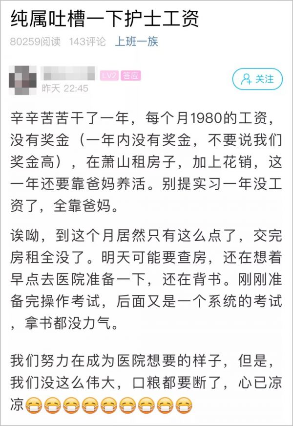 护理人在吐槽:平时工作繁忙,薪资太低,入不敷出。而且地位又不高。