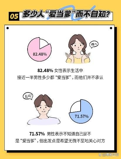 据调查,82.48%女性表示生活中接近一半男性多少都“爱当爹”,而他们并不承认;也有17.41%男性表示遇到的一些女生也很爱当爹;71.57%男性表示不知道自己是不是“爱当爹”,但出发点是希望无微不至地关心对方。