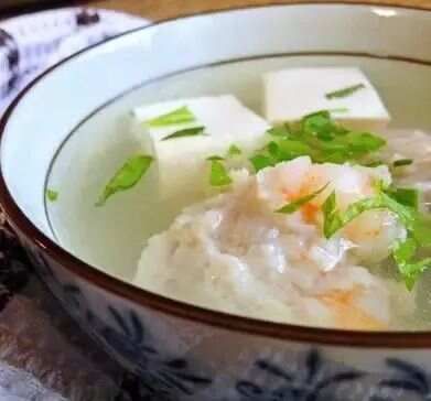 鸡胸肉50克、豆腐30克、葱末5克、提前熬好的鸡汤大骨汤之类100克、盐少许。
