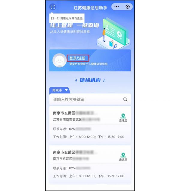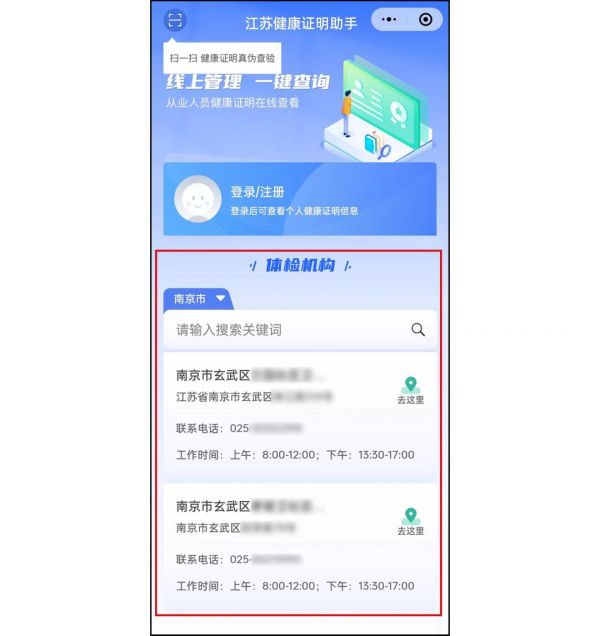 从业人员如果需要进行体检和办理健康证明,现在可以在页面查看所在城市的体检机构。