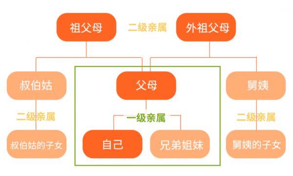 一级亲属,指的是自己的父母、兄弟姐妹。二级亲属指的是祖父母、叔叔、伯伯、姑姑以及他们的子女;外祖父母、舅舅、阿姨以及他们的子女。可以参照图片来更清晰的理解。