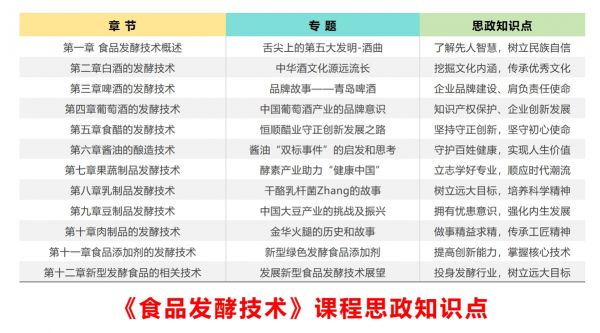 发酵食品在我国历史悠久,让学习者了解中国传统发酵食品的奥秘,树立民族自尊心和自豪感,同时把发酵食品研究前沿动态、研究成果、产业发展趋势,融入课程内容,录制12个课程思政视频知识点,包括文化传承、产业政策、品牌故事、科学家精神、工匠精神等,这些内容有助于激发学习者的求知欲和探索心,激发学生对食品发酵相关产业的兴趣,引导学生积极服务社会,树立社会主义核心价值观。
