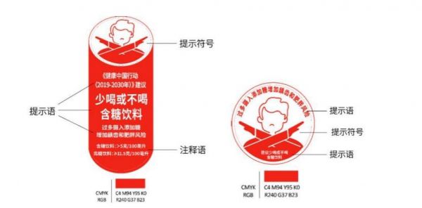 含糖饮料健康提示标识一套三款,包括红色、橙色、绿色标识,三款标识同时应用。