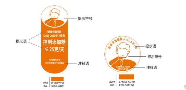 ❥橙色标识为每日添加糖摄入限量提示标识,提示符号为圆形,内含暂停手势的人型图案。