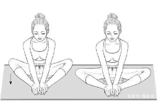 2、蝴蝶式:正坐在瑜伽垫上,两脚掌相靠,两手扶双脚或双膝轻轻下压。注意脚掌不要分开,膝盖压到不能再压时,停留5到10秒,然后慢慢还原,如此重复10次。