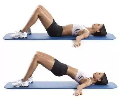 3、臀桥:屈膝仰卧,肩胛靠向中轴,臀部发力,慢慢提高臀部,感受臀肌发力,然后回到原位,重复20次。