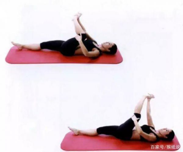 1、拉伸小腿外侧:仰卧在瑜伽垫上,左腿髋曲、膝曲,用左手按住左膝后方,右手握住左前脚掌,然后逐渐伸直左膝,同时将左脚向右下方拉伸。