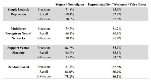 研究结果显示,在15879条微博中,6.09%的微博被确认为抑郁症污名信息。其中,最常见的三种污名类型是:认为抑郁症患者的言行举止难以预料(不可预知污名)、认为罹患抑郁症是个性软弱的表现(软弱污名)、认为抑郁症不是一种医学疾病(诈病污名)。分类预测模型的训练结果显示,区分污名与非污名微博的精确度可以达到75.2%(F-Meaure);区分最常见的三种类型的污名微博的精确度可以达到86.2%(F-Measure)。微博用户在发布抑郁症污名信息时,会更多使用一些特定类别的词汇,包括:差距词、排除词、消极情绪词、社会历程词、暂定词。